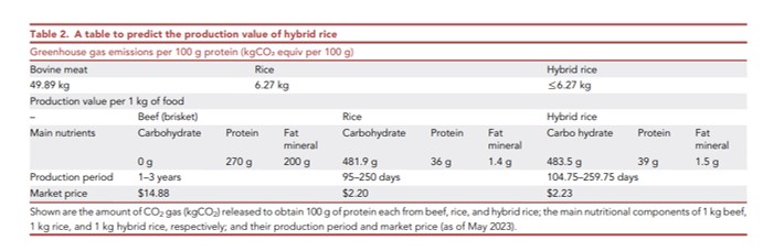 The table below outlines the nutritional content, cost, and environmental impact of the hybrid rice compared to normal ‘bare’ rice and bovine meat and shows very favourable results.