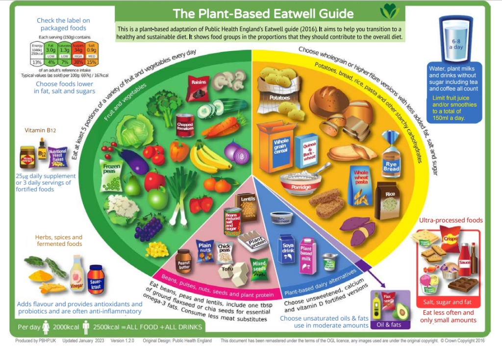 Below is an adapted version of the Eatwell Guide produced by the Plant-Based Health Professionals UK, their website along with ProVeg International provide plenty of free resources including recipes and meal planners for a plant based diet.