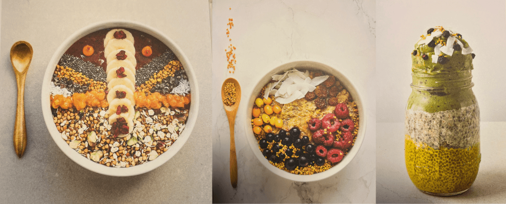 Probably the easiest way to incorporate seeds into your diet is at breakfast as they make the perfect accompaniment to most cereals, yoghurt and eggs in any form, they can enhance the taste and texture of most food. If you dislike the taste, they can become easily disguised by mixing well into your food and if you need to convince children, make it a fun activity by encouraging them to add their own, make pretty toppings as shown below or by mixing them with ice cream sprinkles adding less and less as they become more accustomed to the seed taste.