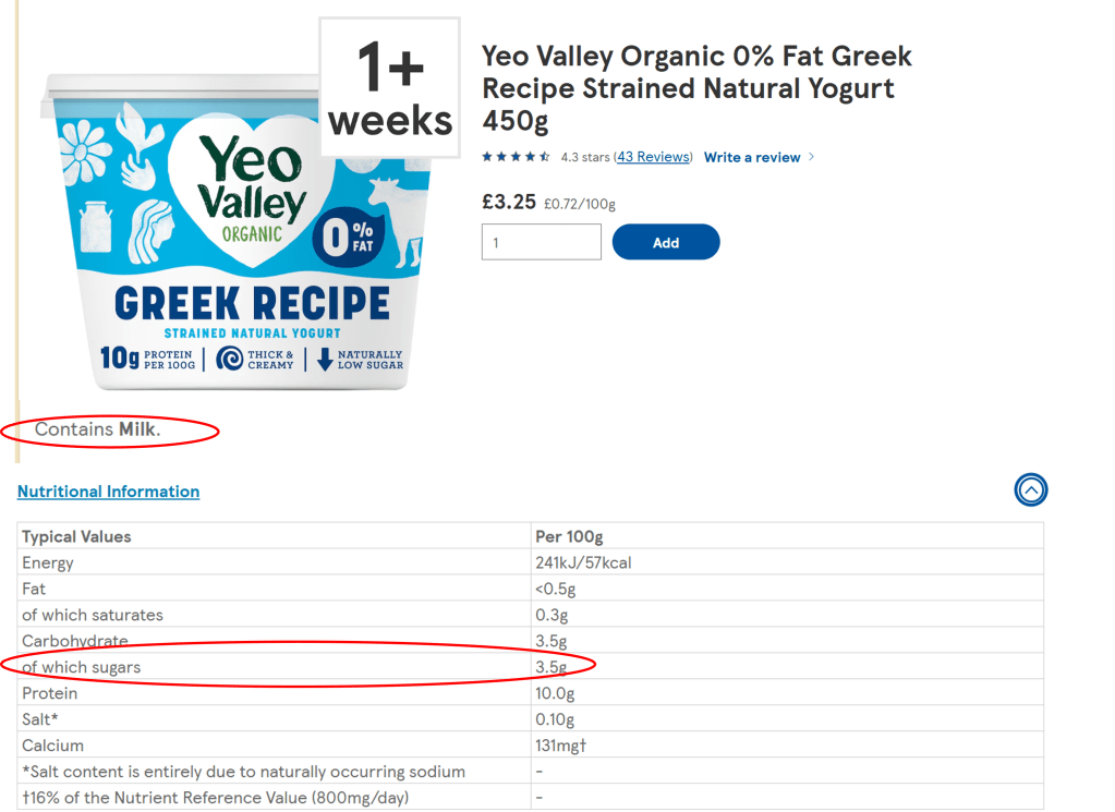 – Ingredients; these are listed in order of highest content first, generally the shorter the list the better, look out for ingredients that you wouldn’t find in an average food cupboard e.g. emulsifiers, flavourings, colourings, these are commonly contained within ultra-processed food and intake should be kept to a minimum especially for children.