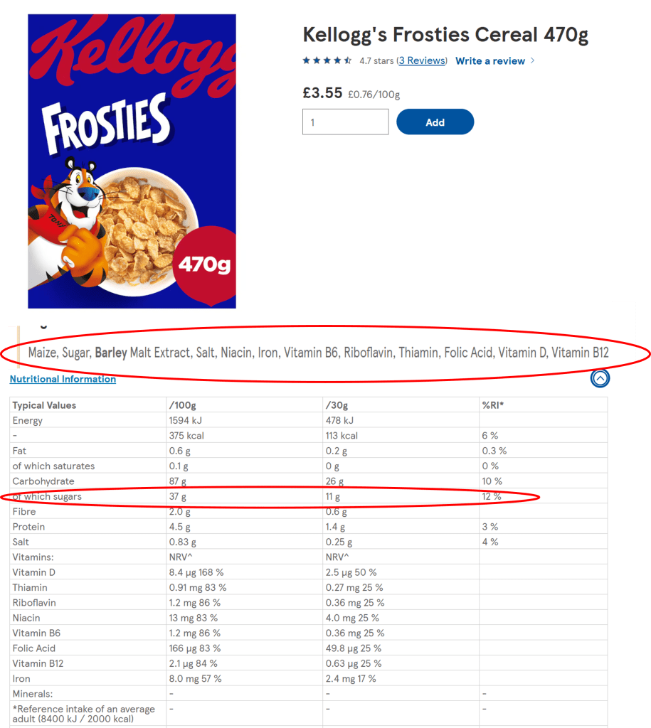 Next, breakfast cereals, these are both fortified with a variety of vitamins and minerals, an essential source for many children. The Frosties cereal has an extremely high sugar content of 37g per 100g compared to 1g per 100g of Ready Brek which also has a much higher fibre content, this is important as fibre intake is generally low for most of the UK population (Norton et al., 2024)