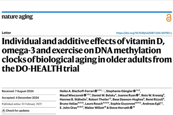 Bischoff-Ferrari, H. A., Gängler, S., Wieczorek, M., Belsky, D. W., Ryan, J., Kressig, R. W.,…Horvath, S. (2025). Individual and additive effects of vitamin D, omega-3 and exercise on DNA methylation clocks of biological aging in older adults from the DO-HEALTH trial. Nat Aging. https://doi.org/10.1038/s43587-024-00793-y