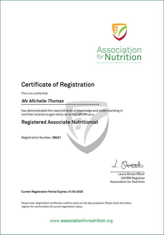 This week I happily received my renewal certificate for registration with the UK Voluntary Register of Nutritionists (UKVRN). The UKVRN is run by the Association for Nutrition (AfN) a registered charity that works to benefit the public by advancing standards of evidence-based practice across the field of nutrition. The AfN ensures that all registered nutritionists are regulated and working to recognised standards and competencies. Registrants are expected to keep up to date through Continuing Professional Development (CPD) to ensure evidence-based practice is maintained.