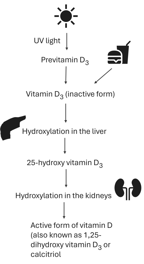 The chart below shows how vitamin D is made in the body, an inactive form is produced via UV light or ingested from food (oily fish, eggs, fortified products, supplements), this then goes through two processes of hydrogen and oxygen molecule additions within the liver and kidney resulting in an active form, this process takes around 36 hours and the vitamin D can be stored until needed.