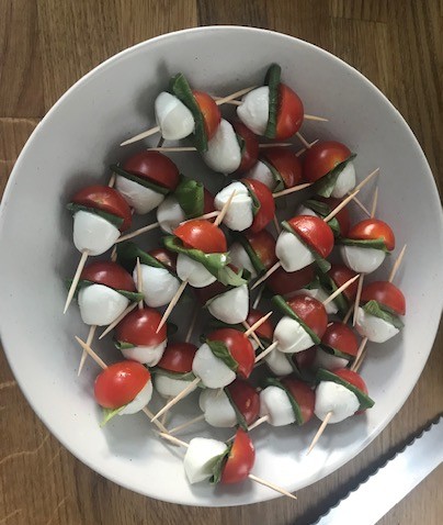 - Half cherry tomatoes, thread on a cocktail stick with a mini mozzarella and a basil leaf.