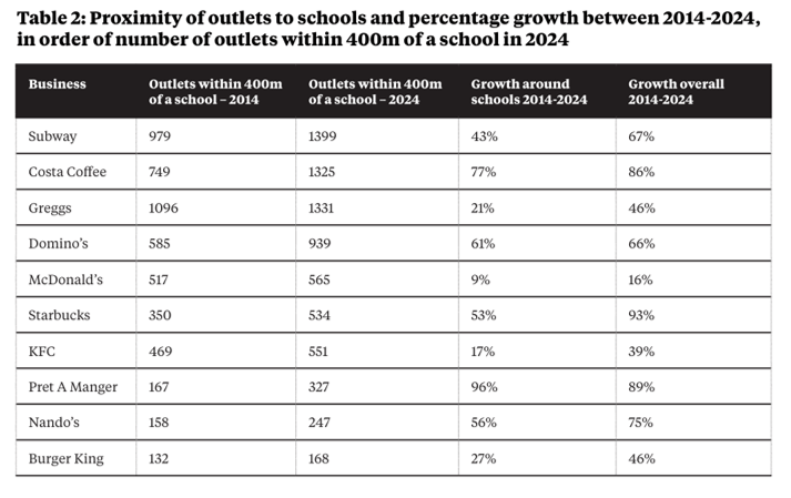 - All of the food outlets listed have opened close to schools, 10.3% of schools in the UK had at least one of these outlets within 400m of the school gates in 2014, this rose to 14.2% in 2024. Half of the top 10 are estimated to have at least half of their outlets close to schools
