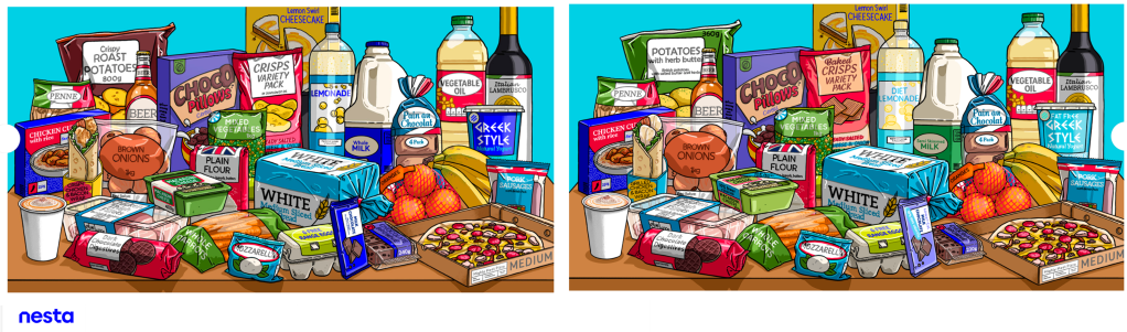 They then applied realistic, minor changes to the basket contents and found that these changes could reduce calorie intake by 8.5% without compromising on nutritional content or increasing cost. The 8.5% reduction which translates to ~232 calories/day might not sound a lot, but a previous study carried out by Nesta (Mariani et al, 2023) showed that for those living with excess weight this could halve the prevalence of obesity, and considering the most recent statistics from 2023 – 2024 show that in England 64.5% of adults are overweight or obese (UK Gov, 2025) this could make a difference to a significant proportion of the population.