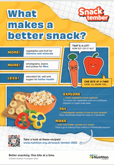 Snack-tember hopes to raise awareness of the need for children to make and consume healthier and more sustainable snacks. The BNF will be supporting schools who are participating in Snack-tember with materials such as recipes, posters and activity ideas. To find out more, visit: https://www.nutrition.org.uk/snack-tember-2025/.