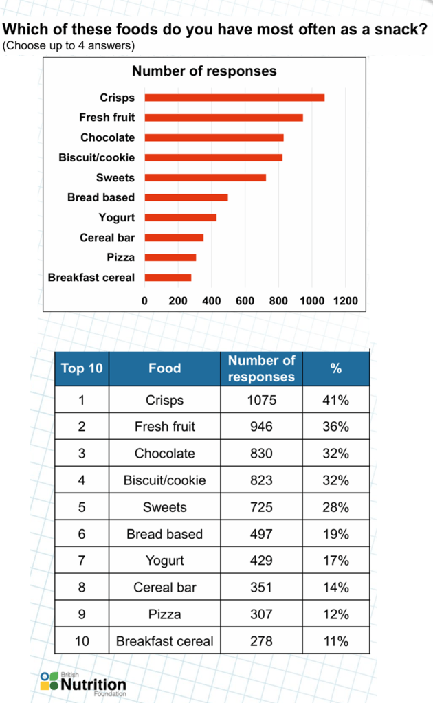 The results of the BNF survey showed that most snack choices are typically those high in salt, sugar and fat, 79% snacked two or more times a day and most of these were eaten after school with most finding it difficult to choose healthy options.