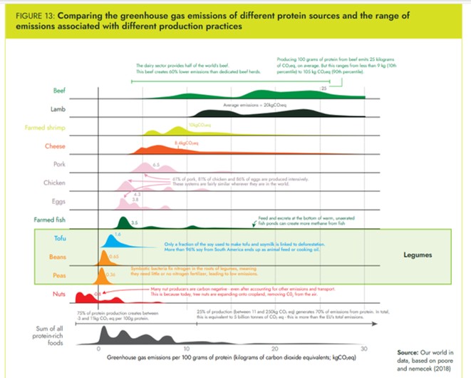 ENVIRONMENT – bean consumption contributes substantially less greenhouse gas emissions (GHGE) compared to the production of meat, 1Kg of beans produces 1.8Kg GHGE, 1Kg of meat produces 99Kg GHGE.